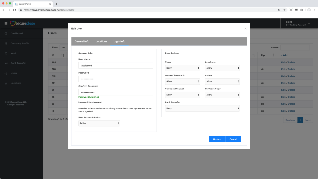 SecureClose Vault – Setting this to Allow will let the new user view the Vault tab in the Admin Portal.