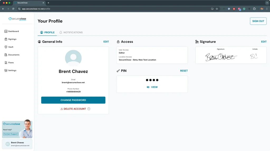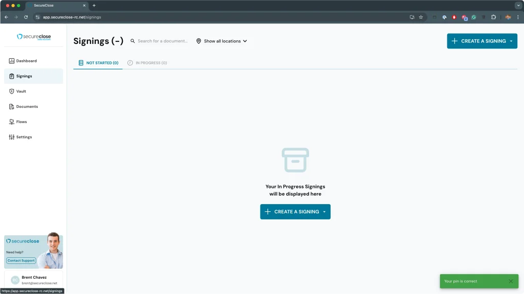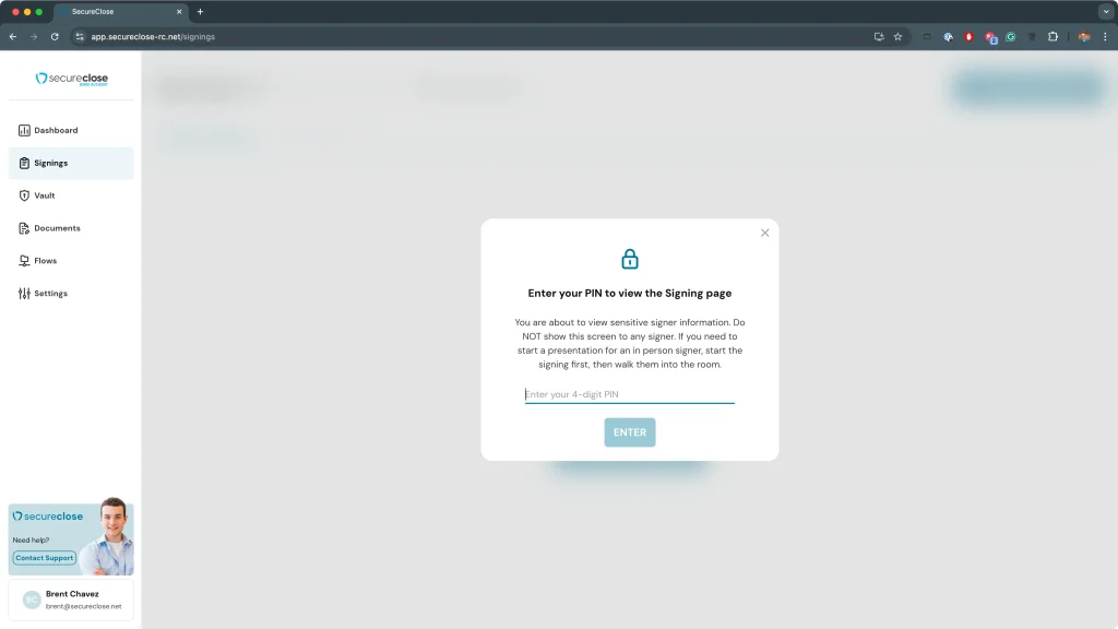 1. Click on the Signings Tab. Since signings contain customer information, the first time you log in in a session, you will be required to input your unique 4-digit PIN to view this page. If you don’t know your PIN, click on Your Name in the bottom-left side of the screen. This will take you to your user settings screen, where you will see a section marked PIN. Click on the View Icon, and it will reveal your PIN. Enter this on the Signings Screen to proceed.