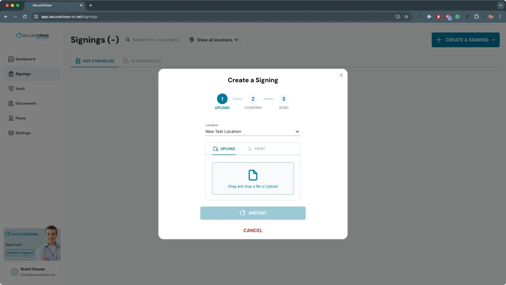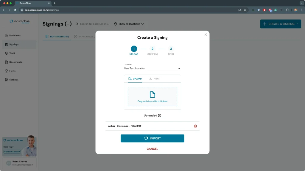 3. Upload your Document(s) – If you have multiple locations available to your user name, first select the Location that you want this signing to apply to. Make sure you select the location that the document and flow you are using belong to. Drag and drop your file into the upload field, or click on the Upload field itself to navigate on your computer for the file. Once selected, click the Import button.