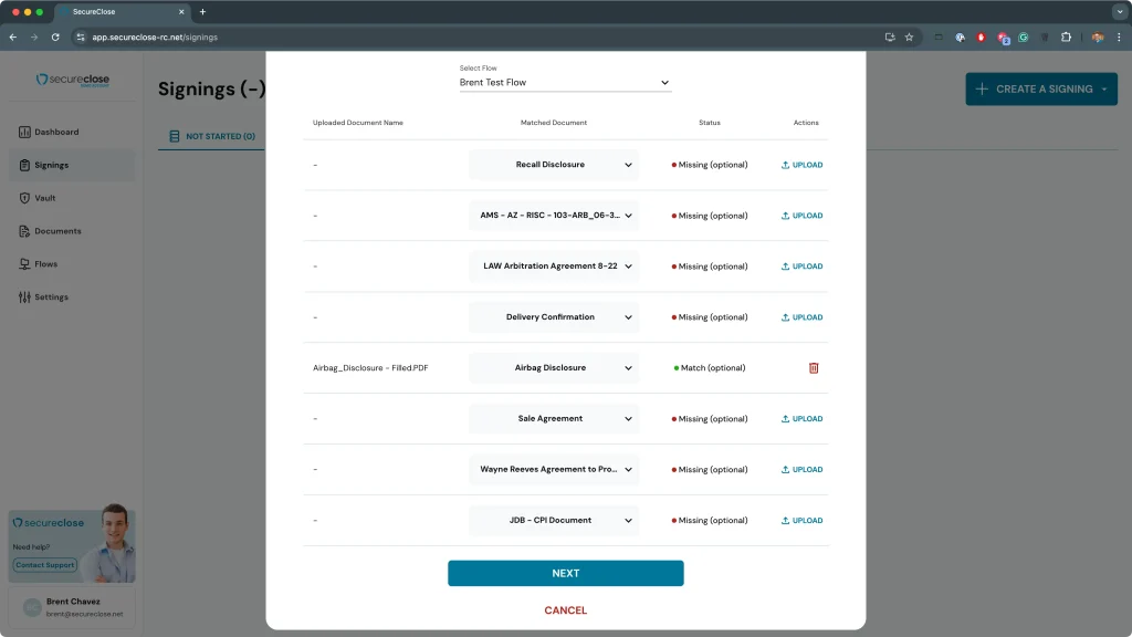 5. Confirm the Document and Flow – Once your document and flow are identified, SecureClose will display all of the documents in that matched flow. It will display which document(s) your upload was matched to for your confirmation, as well as showing any Required documents that may be missing. If