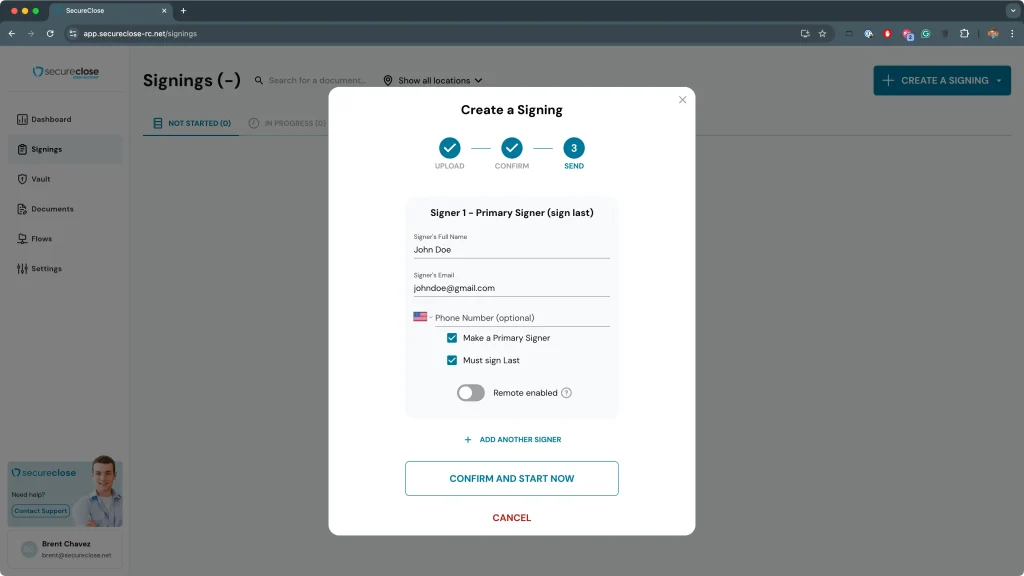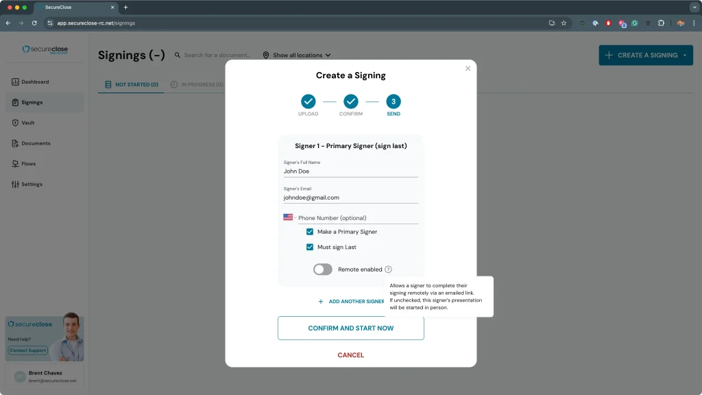 Remote Enabled – If this toggle is set, it will email the signing to the address provided so that the signer can complete it at home! If this option is not toggled, the system will store this as a signing to be completed in person at your location. Please Note – You can mix and match remote and in-person signings depending on where your signers are! For example, if your primary signer is at your location, but your signer 2 is remote, simply set the Remote Enabled toggle for the second signer! Once all information is entered, click on the Confirm and Start Now button.