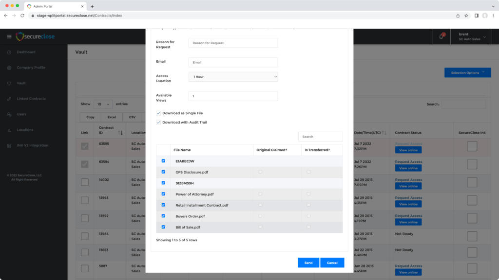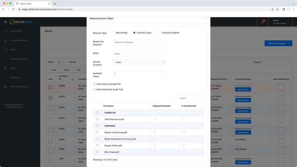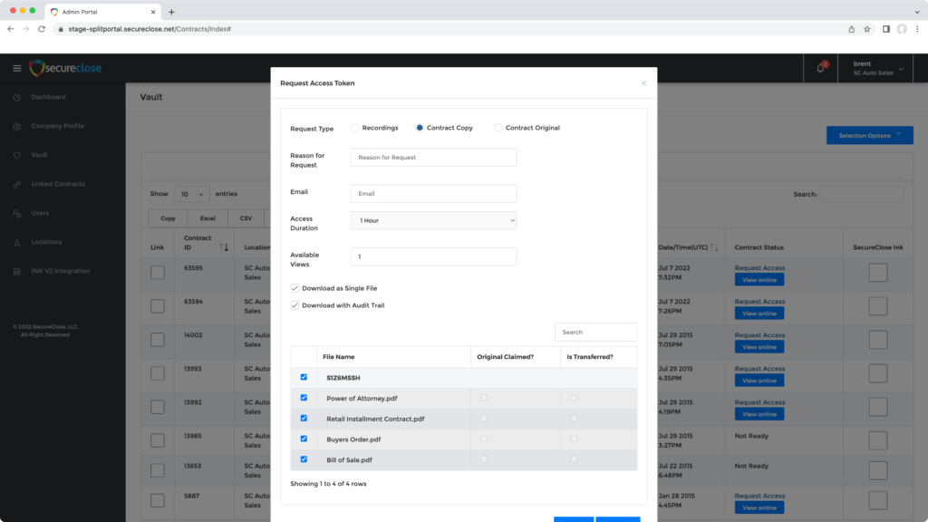 You should now see the Selection Boxes next to the linked transactions greyed out. If you click on the Request Access link next to any of the linked transactions, when you view the Contract Copy or Contract Original tabs, you will now see a list of each linked transaction, along with the individual documents associated with it. You can choose to action each individual document on its own, or as a single file together.