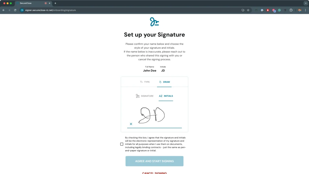 5. Submit Initials – Once the signature is submitted, the tab on the mobile device will switch to capture the initials. The signer will draw their initials, and again click Submit. As with the signature, the initials will also appear immediately on the original device in the signing session.