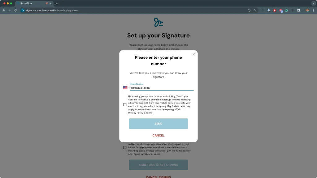 1. Choose Draw on my Phone Instead – Once the user clicks on the Draw tab, they will click on the Draw on my Phone Instead option. The signer will key in their cell phone number, check the Consent box, and click on the Send button.